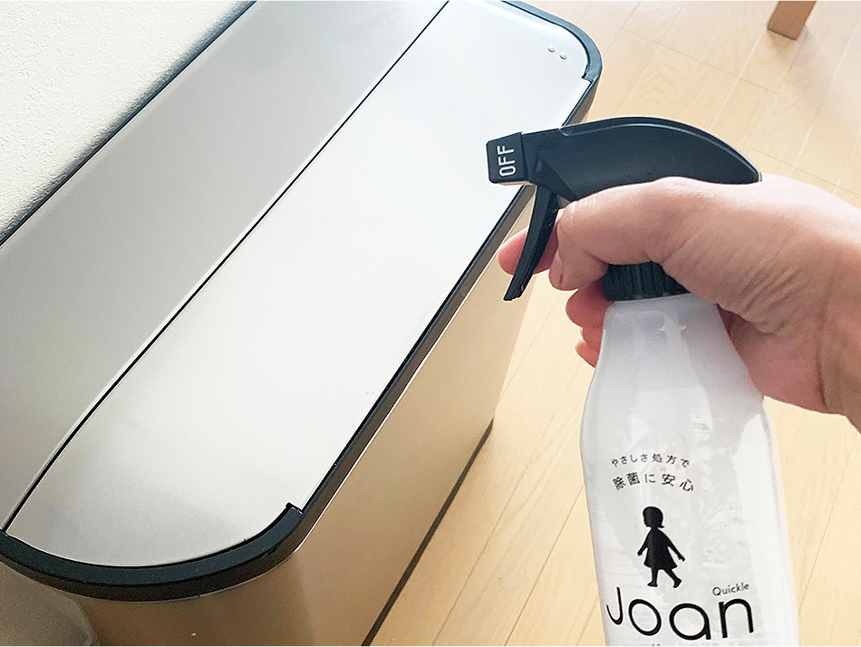 それと、わが家はペダル式のゴミ箱を使っているのですが、ふたは意外とよく触りがちなので、そこにもスプレーをしてふき取って清潔を保つように心がけています。