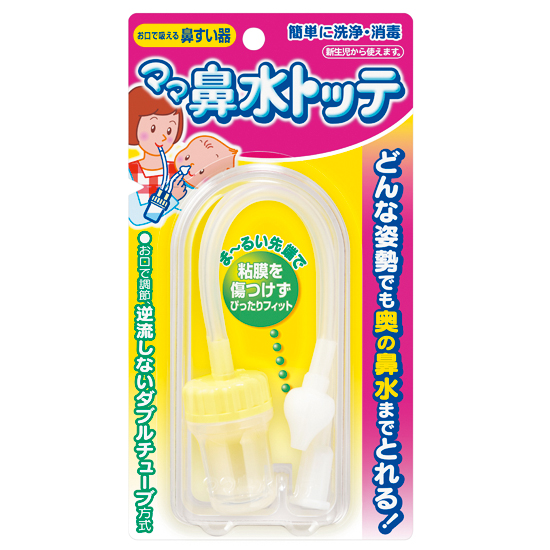 耳鼻科医が考案した、ママ・パパが口で吸うタイプの鼻水吸い器。吸う力を調節しながら奥の鼻水まで吸い取れます。お手入れも簡単で、お出かけにも便利な大きさです。
