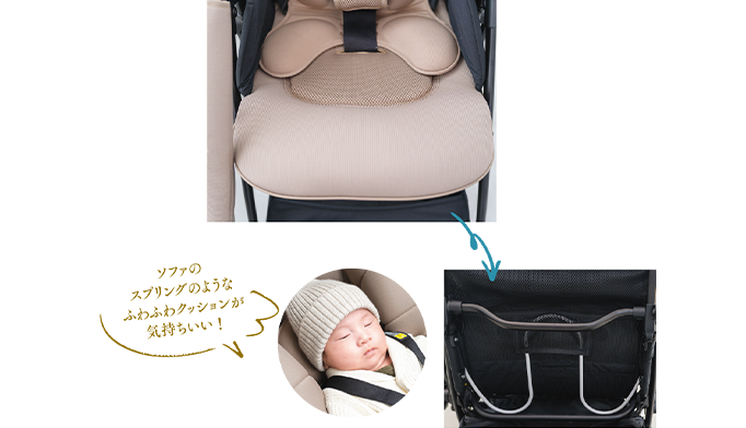 人気のヒミツを深堀り!座面下にソファのスプリングのような構造の“オメガクッション”を搭載。頭の部分には、伝わる衝撃を半分にする※1Gブロック内蔵のヘッドパット“ショックレスマモール”が!トップクラスの振動吸収性※2で、最適な乗り心地をかなえます。
