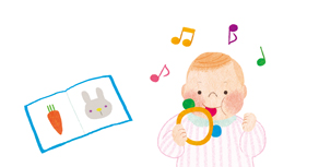 赤ちゃんと一緒に遊ぶのがますます楽しくなる時期。軽くて握りやすいおもちゃを持たせると、握って振り回したり、口に持っていったりします。ガーゼなどの端を持たせると、ギュッとつかんで引っ張るので、引っ張りっこをしても楽しいでしょう。公園などのお散歩で自然に触れさせるなど好奇心を刺激し五感を育てましょう。ねんねのときは、ユラユラ抱っこや背中をトントンするなど、好みの寝かしつけを探しましょう。
