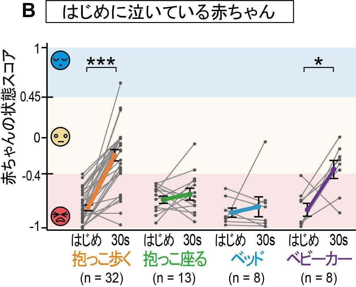 「おとなしくしていた赤ちゃんや少しだけぐずっている程度の赤ちゃんは、動いていた(抱っこして歩く、ベビーカーを動かす)ときには心拍数に変化はなく、様子も変わりませんでした。しかし、動いていない(座って抱っこ、ベッドに置く)ときは心拍数が多くなり、泣き出してしまう傾向にありました。
