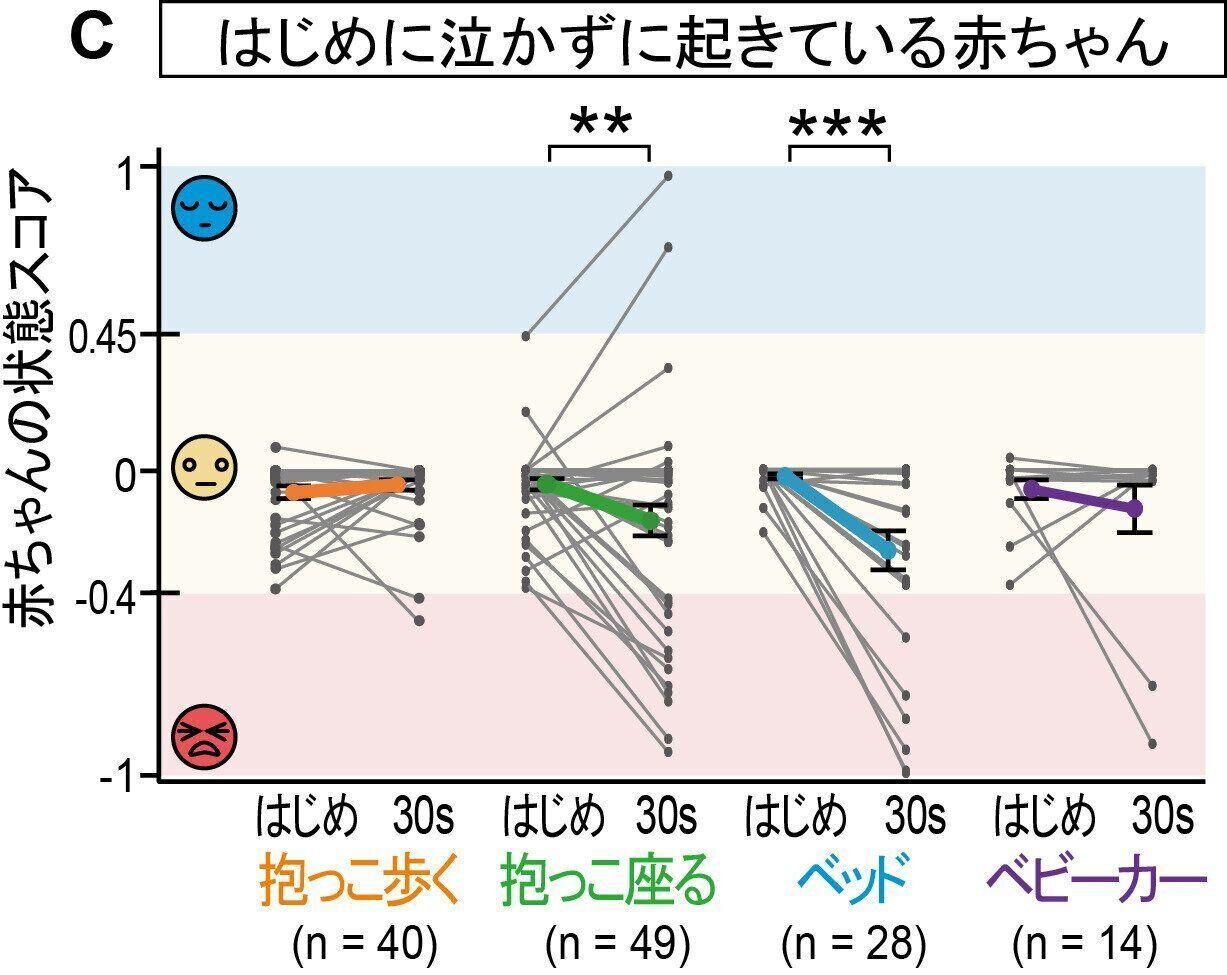 Cは泣かずに起きている赤ちゃんに4つの行動を行ったときの、はじめと30秒間後の状態スコアの推移です。