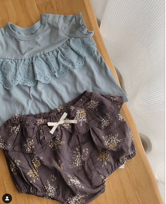 くすみブルーのかわいいフリルTをゲットしたというMISAKIさん。花柄のフリルブルマとあわせて涼しげなコーデを見せてくれました。Tシャツはなんと579円というプチプラ!高見えする夏コーデですね。