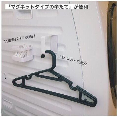 清水さんは100均のアイテム、マグネットタイプの傘立てを使ってハンガーを収納しています。マグネットがつけられない場所では、マグネット用取り付けプレートを使えば問題なく使えるようです。洗濯ばさみなども一緒に収納できて便利そうですね!