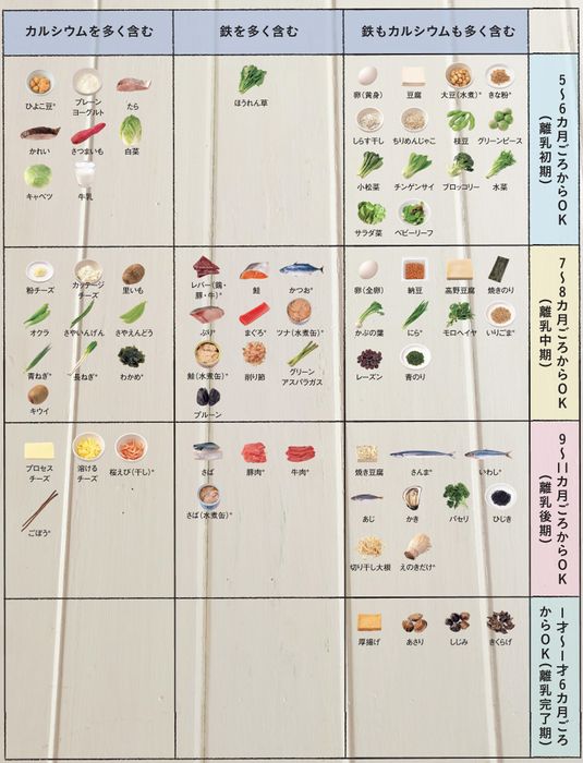離乳時期別に食べさせられる、鉄・カルシウムを多く含む食材