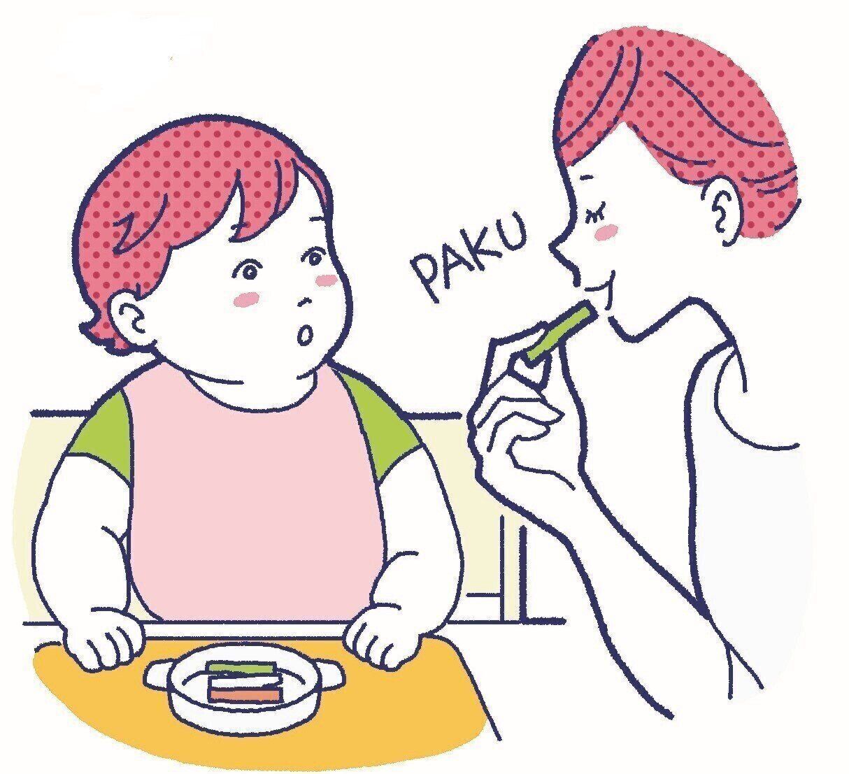 最初は大人が食べるお手本を見せます。次に大人が赤ちゃんの手を持って、口に持っていき、一口分食べられるように教えます。