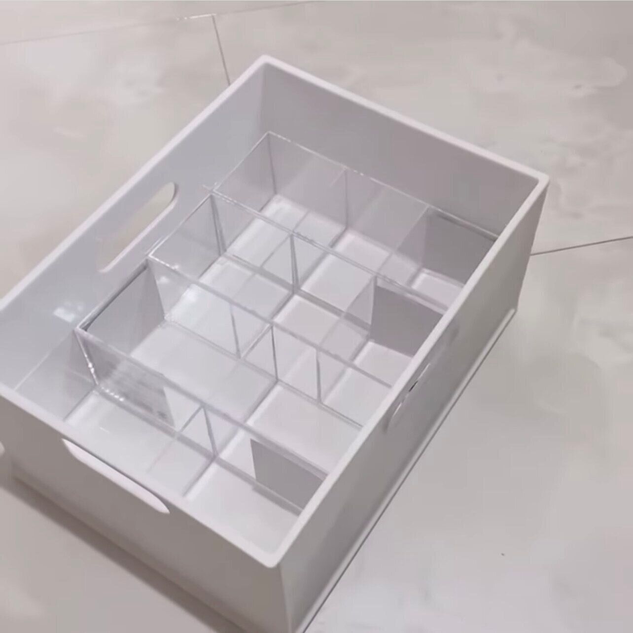 こちらはセリアとニトリの収納ケースを組み合わせてシンデレラフィットを実現。ニトリの「インボックス(クォーター)」と、セリアの「仕切り2トレー」「仕切り3トレー」を2つずつ組み合わせるととても綺麗にフィットしたようです。mhh1129さんはここにハンカチやマスクなどを収納し、お子さんの身支度セットとして利用しているそうですよ。