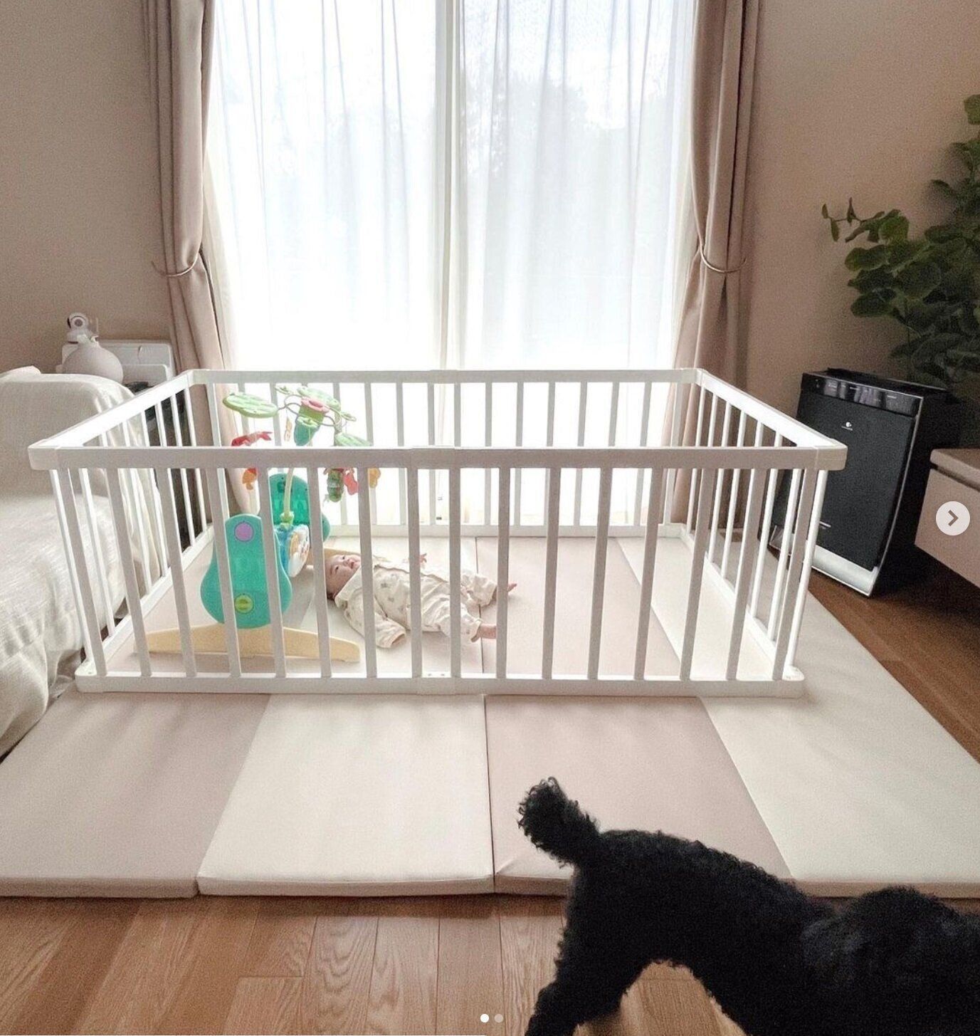 nanaさんのお宅では犬や猫を飼っているそうで、お子さんが日中ゆったり過ごすためにサークルをGETしたそう。ずり這いやハイハイが始まったらサークルを大きな形に変形させようと思っているんだとか♪