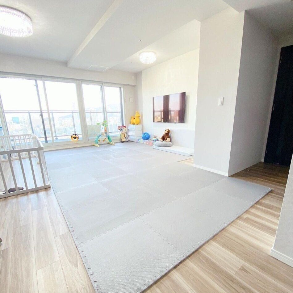satomi.wさんはジョイントマットを使ってベビースペースを作っているとのこと。ジョイントマットならお好みのインテリアに合わせてスペースを調整できるのが便利ですよね。くすみカラーのデザインもオシャレですね♪