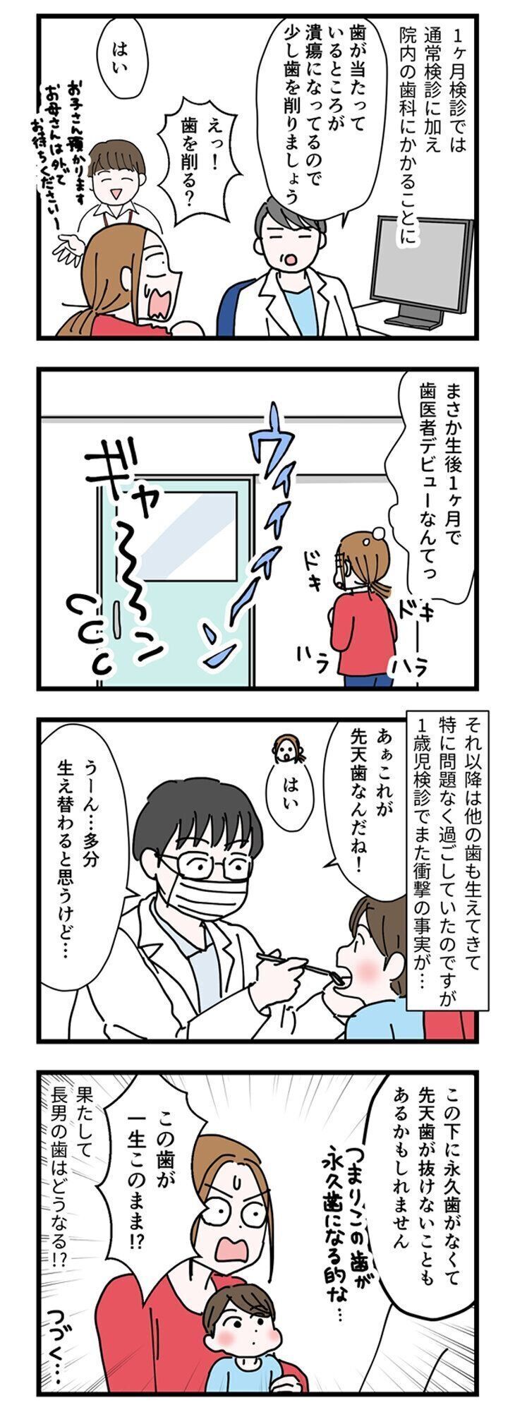 成長するにつれ、少しずつ先天歯もニョキッと出てきたけれど、通常の歯よりも小さく、色も黄色っぽくて、柔らかくて、弱々しいその歯。いつか抜けて立派な永久歯が生えることを期待していたら、1歳の時の検診で永久歯が生えてこないかもしれない…というまたまた予想外のことを言われ…。さて、いったいどうなるのでしょう…。
