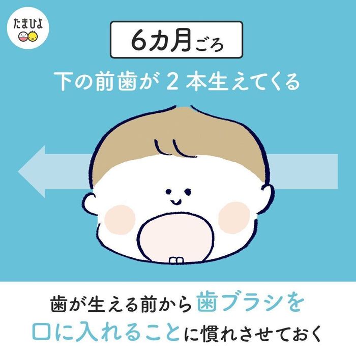 6ヶ月ごろ、下の真ん中の前歯が生えてきます。ゆっくりの子は1歳近くになって生え始めるなど個人差も。