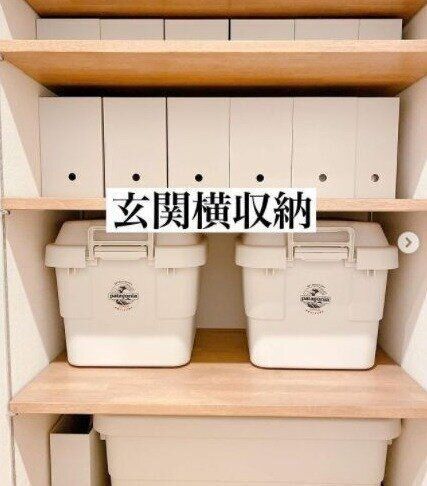 __usamegu__さんは玄関収納に無印良品の収納アイテムを活用しています。PPファイルボックスにはスリッパやマスクなど、玄関の近くで使うものを入れ、PP頑丈収納ボックスにはレジャーシートや外遊びおもちゃを入れているそう。白で統一されているのですっきり見えますね。