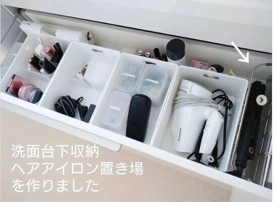 うーさんは洗面台下に化粧品やドライヤー、コンタクトレンズなど毎日使うものを収納ボックスに入れています。ヘアアイロンを収納しているのはもともとキッチンについていたスポンジラック。ぴったりフィットしていて使いやすそうですね。