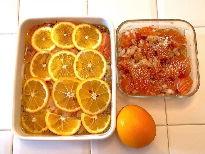 Kayomiさんが作ったのは、コストコのサーモンを使ったサーモンマリネとサーモンポキ。サーモンマリネはたっぷりの粒マスタード入りなので、本格的な味が楽しめますね。サーモンポキは、器に盛るタイミングでアボカドと合わせるといいんだそう。
