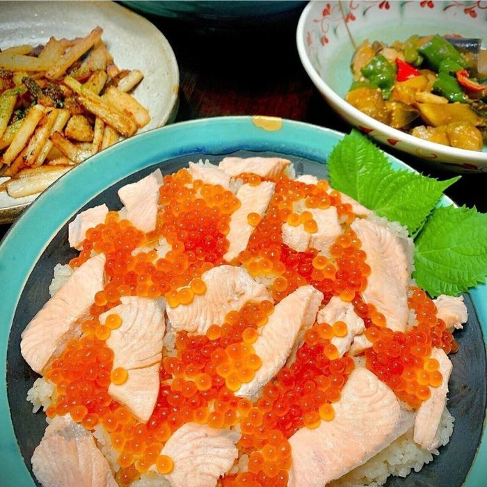 たっぷりのサーモンといくらを盛り付けて♪ はらこ飯
