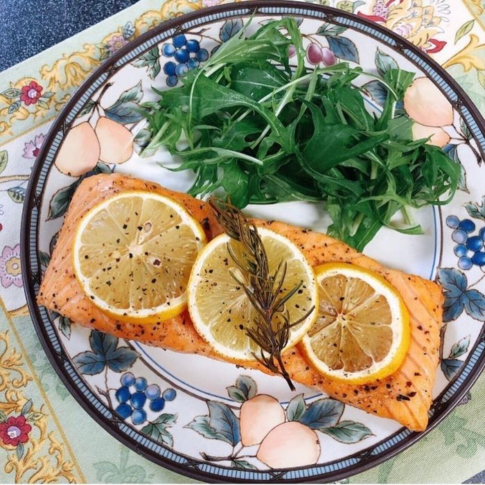 こちらはサーモンのオーブン焼き。塩胡椒にドライハーブで下味を付け、espresso.gohanさんが家庭菜園で育てたローズマリーと輪切りのレモンをのせて焼きあげたそうですよ。脂がのっているコストコのサーモンですが、あっさりと食べたいときにピッタリなレシピですね。