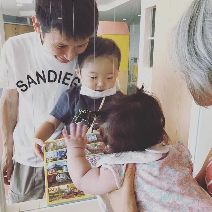 (上の写真は、面会できない妹に、ガラス越しに絵本を見せているところ)