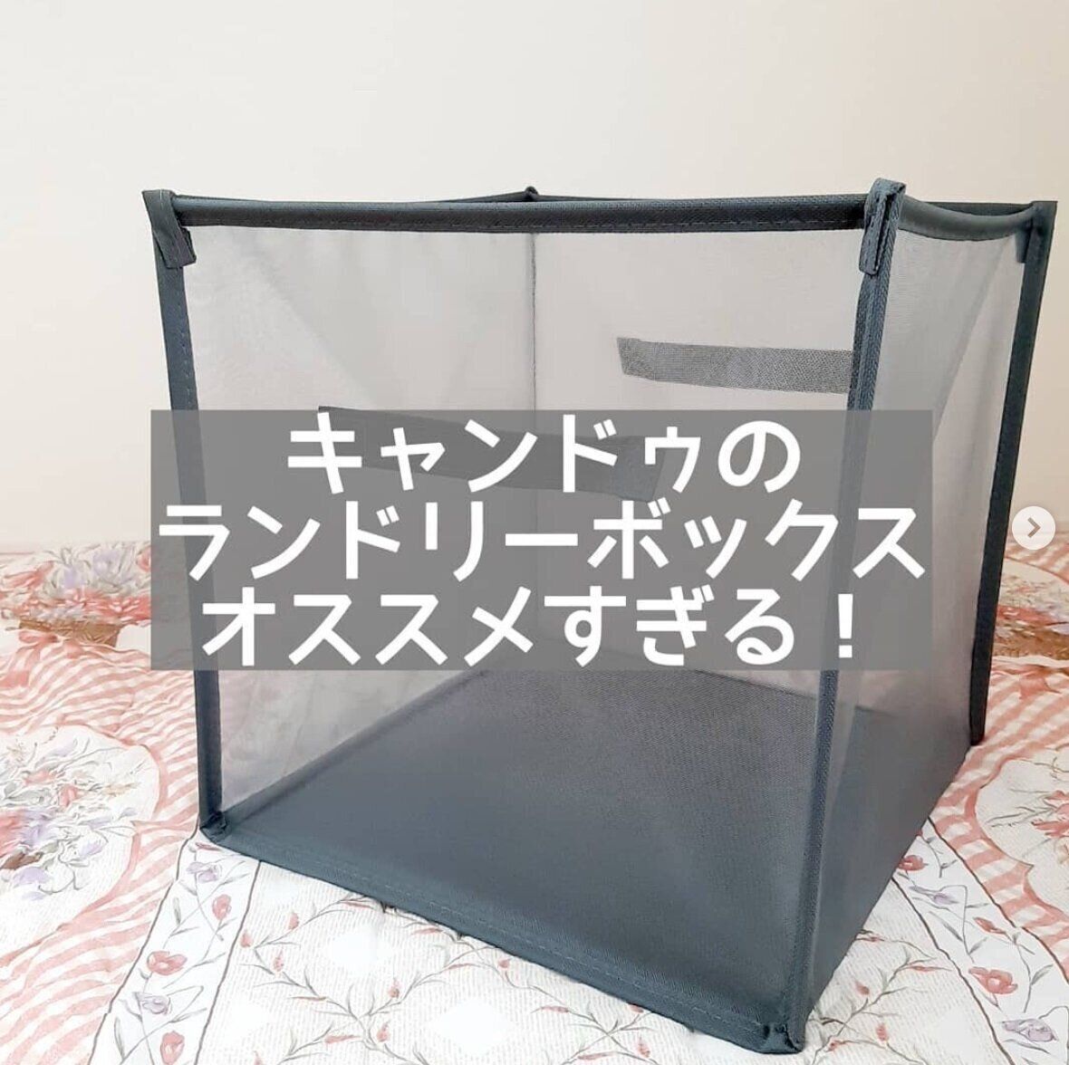 こちらは550円商品のランドリーボックスです。33cm四方の立方体でサイズ感もよく、作りがしっかりしているそうです。アキさんのお宅ではお子さんのパジャマ入れとして使っており、収納時は折りたたんで洗濯機横にしまうそうです。