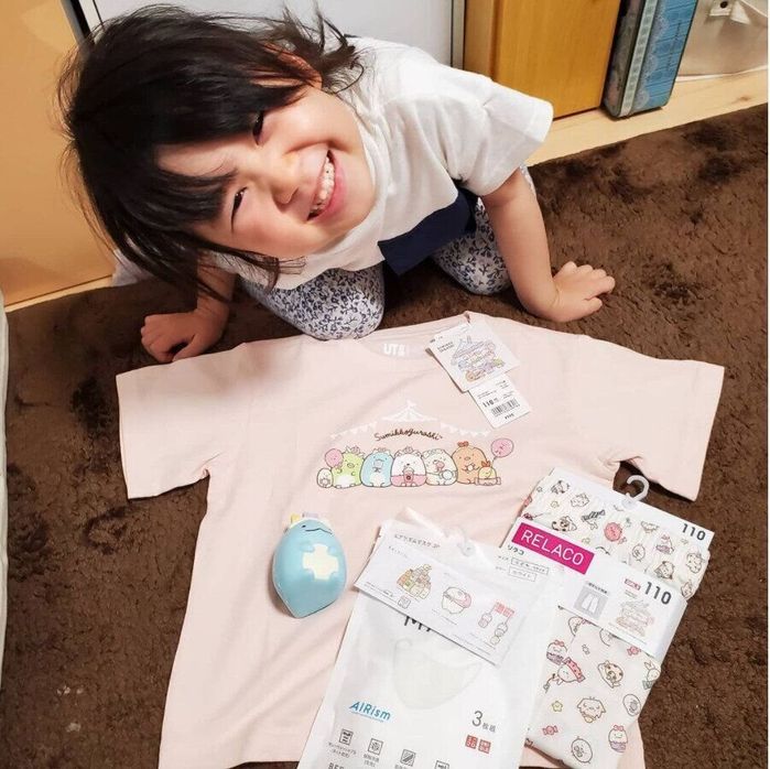 ぽよさんはこちらのアイテムを購入。Tシャツ、リラコ、スクイーズ(とかげ)、エアリズムマスクをゲット。すみっコグッズ満載でとっても可愛らしいですね。娘さんの笑顔もとってもキュート。こちらまで笑顔になっちゃいますね!