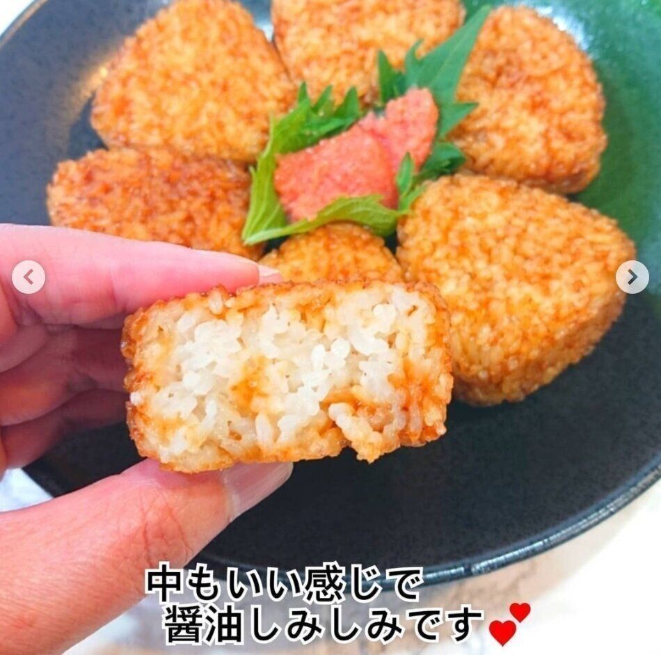 きりさんが冷凍庫に常備しているのがこちらの焼きおにぎりです。レンジ調理だけで醤油がよく染みている焼きおにぎりが食べられるのは嬉しいですよね。さらに、こちらの方は辛子明太子をトッピングしたそうです◎