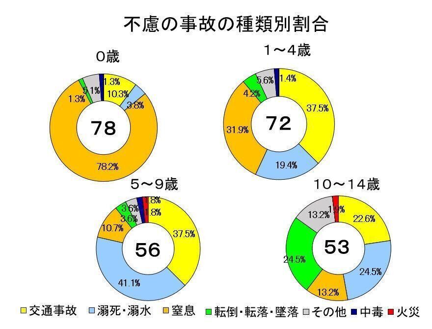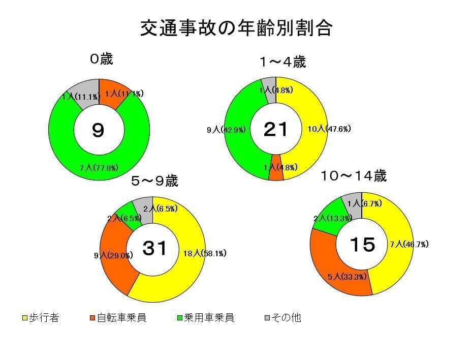 さらに、不慮の事故の内訳を見てみると、0才代の2位、1~4才の1位、5~9才の2位が交通事故でした。つまり、交通事故は子どもの死因の大きな原因となっているのです。