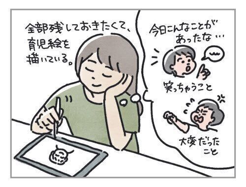 子育ての、幸せな瞬間も、辛いことも、笑っちゃうことも。全部を大事に残しておきたくて・・・自分はそのために、育児イラストを描いてるようなところはあります。今日あったことを思い出しながら、残しておきたいことを記録しておく。でもそれって、みんなができるわけじゃないし、そう時間も取れないですよね。