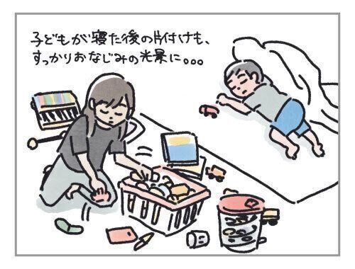子どもが寝た後に、足の踏み場を確保するために静かに片付けるのも、すっかりおなじみの光景に。ただ、こちらも疲れているし、起きたらまた散らかることがわかっているため、最低限の片付けです。ブロックとか踏むと本当に痛いので、それだけ・・・最低限。遊んでいたオモチャ一つ一つに、遊んでいた我が子の姿を感じ、「これで遊べるようになったんだな」とか、少し感慨深くなる時間です。