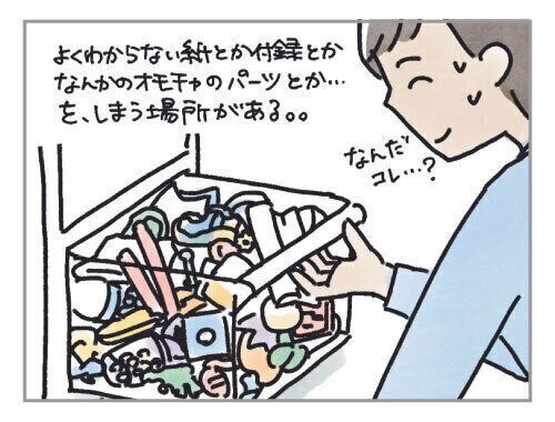 収納がとにかく足りないんですよね。保育園から持ち帰った工作とか、お絵かきした紙とか、雑誌の付録とか、何かのオモチャのパーツとか・・・そういう、よくわからないものたちをしまう場所があります(笑)。ちょっとずつ捨てていかなければ・・・