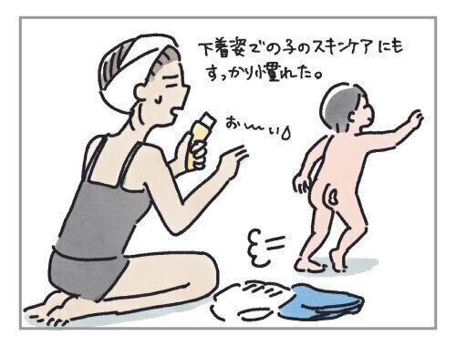 そしてお風呂上がりに、自分は下着のまま子どもの世話をするのも、すっかり板につきました。裸で逃げる子どもを追いかけながら、ワセリンを全身に塗りたくる毎日。ちなみに子どもの肌は本当にきめ細やかでスベスベで、その後に自分のガサガサの肌を触って落ち込むのも、いつものことですね(笑)。