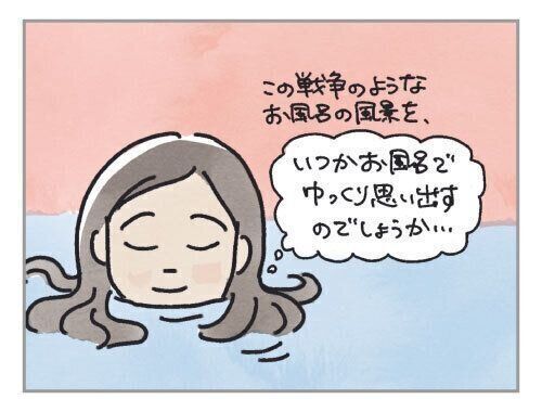 とてもゆっくりできない、戦争のようなお風呂タイム。いつか1人でゆっくりとお風呂に浸かりながら、この風景を懐かしく思い出す時が来るのかもしれません。