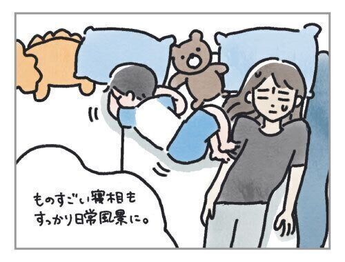 そして、すごい寝相の子どもも、おなじみの光景。子どもの向きや動きに合わせて、変な場所で寝ざるをえないのが、私たち親の宿命・・・。子どもはすごい動きで壁にガンガンぶつかっていくので、枕とか布団とかぬいぐるみが壁に堤防として置いてあるのも、見慣れた風景となりました。