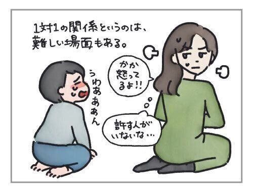 1対1の関係というのは、けっこう難しい場面もあるなと、ときどき思います。例えば子どもを叱る時に、本当は怒っている役と慰める役がいるといいんだろうな、と思うのですが…。いつも私が怒っているだけで、「よしよし、何が悪かったと思う?謝ろうね」と言ってくれる人がいないんですよね。