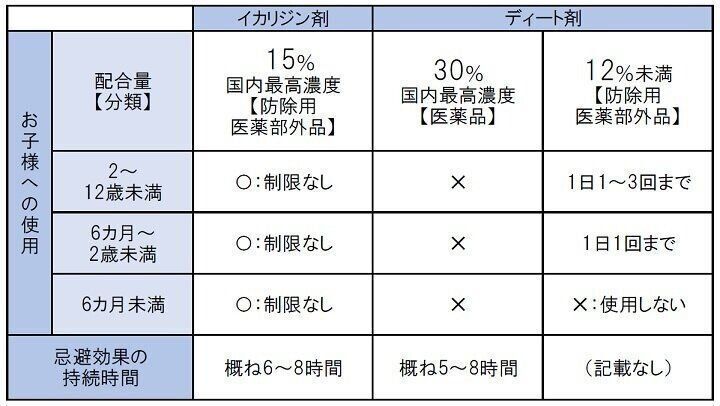 一方、イカリジン剤は日本で認可されたのが2015年と比較的最近であることから商品数は少ないものの、肌にやさしく0歳児から使えます。また、ドイツで開発されてから現在まで20年以上にわたり世界54カ国で使用されているなかで、子どもへの健康被害が報告されていない点も安心感があるといえるでしょう。