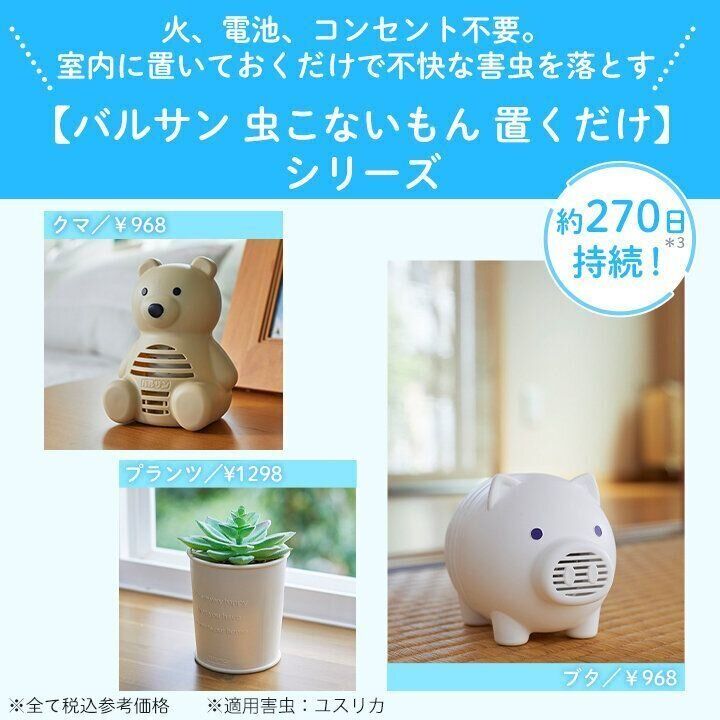 玄関・ベランダからの虫の侵入対策に欠かせない虫よけ。「虫こないもん 吊り下げ」は、クマやリース、ランタンの形がかわいらしく、玄関や窓辺に馴染むデザイン。しかもバルサン史上最高濃度の虫よけ成分配合で、虫よけ効果が約270日も持続*³します。