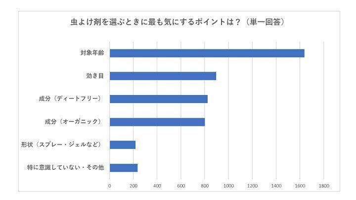 0歳児からつけてあげたい虫よけ剤。でもデリケートな赤ちゃんの肌につけていいのかどうか、迷うところです。妊娠期・育児期のママ・パパのためのアプリ「たまひよ」で行ったアンケート*¹でも、35%近くのママ・パパが虫よけ剤を選ぶときに対象年齢を気にしていることが分かります。次いで、効き目、ディートフリーやオーガニックなどの成分を気にするという声が多く集まりました。