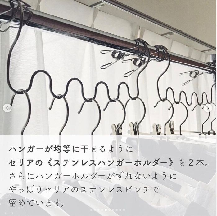 普段から洗濯物は部屋干し派だという なこさん。部屋干ししやすいアイテムを厳選して使っているそうです。選ぶ時のポイントは「省スペース」「移動できる」「乾きやすさ」なんだそう。ハンガーが均等に干せるように100均のハンガーホルダーを使うなどして対策しているそうですよ。