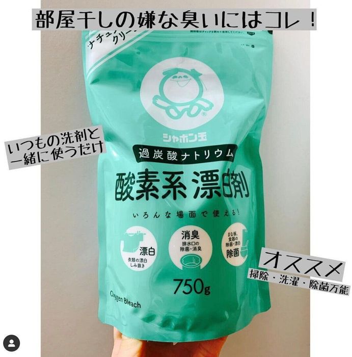JaRさんが部屋干し臭対策に使っているのが、シャボン玉石鹸の酸素系漂白剤。水に溶けやすくて臭いを消してくれるのでおすすめなんだそう。いつもの洗剤と一緒に洗濯機に入れて洗うだけなので楽に対策ができますね。