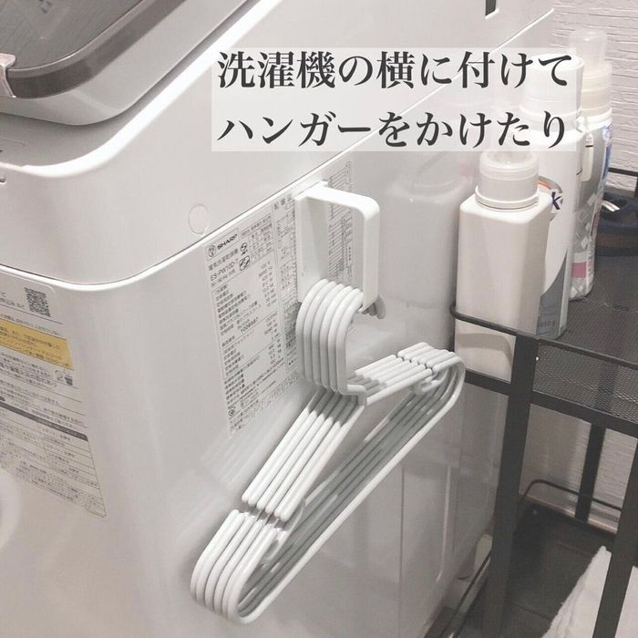 はなさんがセリアで購入したのは、マグネット付D型フック2P。こちらを洗濯機にくっつけてハンガー置き場にしているそうですよ。ほかにもピンチハンガーを引っ掛けて洗濯物の物干しスペースにしても。外では干しづらい下着などを乾かすのにも良さそうですね。