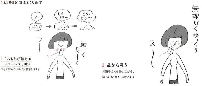 子どもが寝たあとなど、少しゆっくりできるときは、私が考案した「おもち呼吸法」も試してみてください。「溶けるおもち」をイメージしながら息を吐くというもので、普通に深呼吸するより深いリラックス効果が得られます。