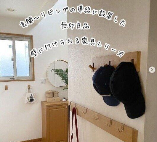 ふぃがろんさんは玄関に無印良品の3連フックを取り付け、帽子やマスクを収納しています。帰宅後にすぐ玄関横に掛けることができるため、とても便利なのだとか。無印良品のフックもシンプルなデザインでおしゃれですね。