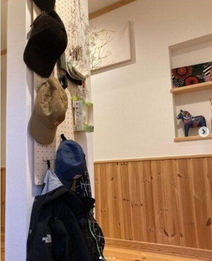 na33naさんは玄関に有孔ボードを取り付け、帽子やマスク、上着などをまとめて収納しています。出かけるときに必要なものをワンアクションでとることができるのだとか。1歳の息子さんもお散歩のときは自分で上着を着て、帽子も被っているそうです。ママは大助かりですね!