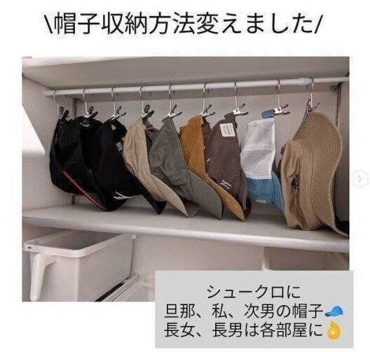 __AMI__85さんは使う頻度が高い帽子をシューズクローゼットの中に収納しています。つっぱり棒を取り付け、キャンドゥで購入したフックピンチで帽子を吊り下げているのだとか。玄関先でよく使う帽子がすぐに取り出せるのは便利そうですね。
