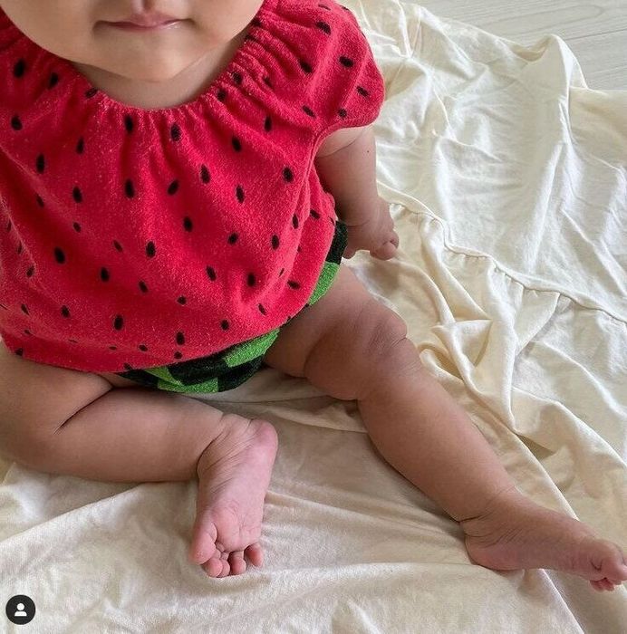 kan.02828さんが購入したのは、スイカのロンパースです。まさに夏代表なコーディネート!部屋着として使用しているそう♪ フレッシュで見ているだけで夏気分になりますね。