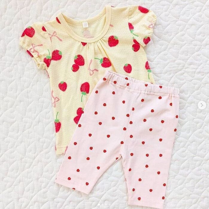 ichigoさんが購入したのは、イチゴ柄のTシャツとレギンスです。Tシャツはパフスリーブで可愛い! 涼しそうな素材なので、これからの季節にもピッタリですね。