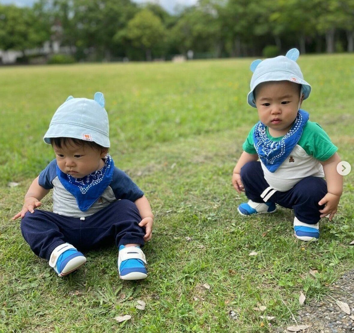 Ucorinさんのお子さんはこちらのコーディネートをセレクト!シンプルな色違いTシャツに、同じスタイや帽子を合わせているのが魅力的なポイントですよね。兄弟やお友達と色違いコーディネートを楽しむのもよさそうです。