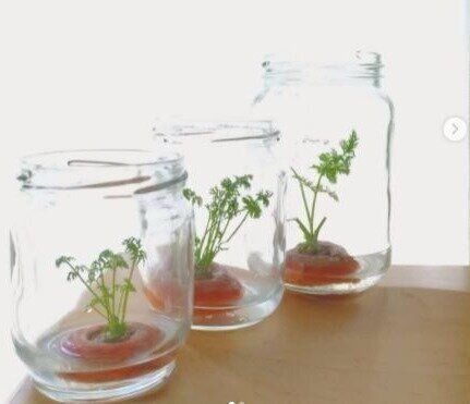 Ayako.Sさんは小さな空き瓶を使ってニンジンのリボベジをしています。葉が育つと、まるで小さな無人島みたいですね。ニンジンの葉は栄養価も高いようなので、スープやサラダ、炒め物などに入れて使えそう!