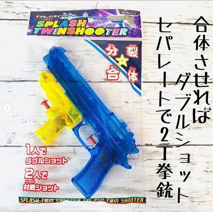 100yen_munyu06さんが購入したのは、キャンドゥの「スプラッシュツインシューター」です。2つの水鉄砲を合体させて遊んだり、取り外して2人で対戦ショットを楽しんだりできるそう♪ これがあれば、水遊びが盛り上がりそうですね!