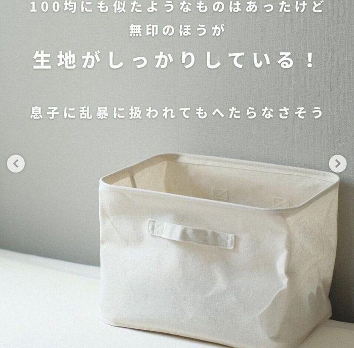 ちかままさんは「ポリエステル綿麻混・ソフトボックス長方形・中」をおもちゃ箱に使っているそう。ずりばいをしているお子さんがおもちゃを取り出しやすく、シンプルでインテリアにも馴染みやすいとのこと♪