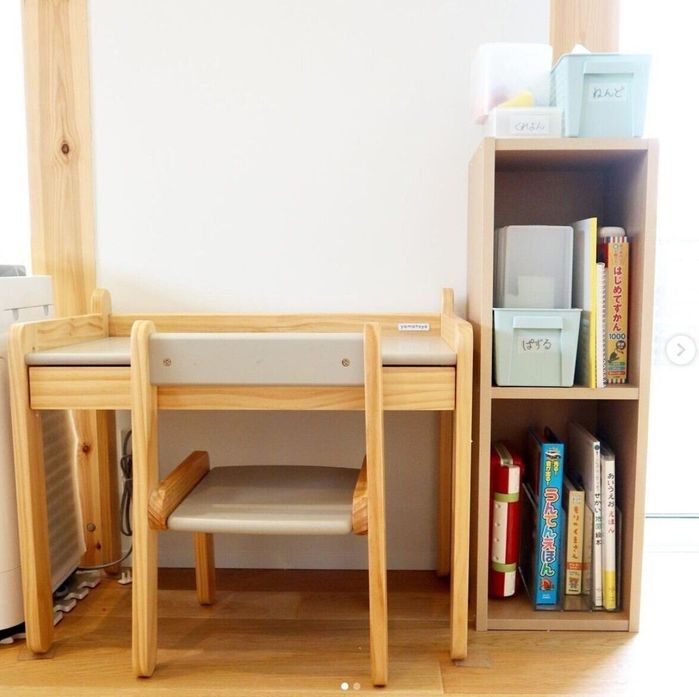 あまえびたろうさんは、キッズデスクの隣にパルプボードボックスを設置したそうです。パズルや図鑑などを入れているとのことで、サイズもピッタリなんだとか。キッズデスクの色味と合っていて、おしゃれですよね。