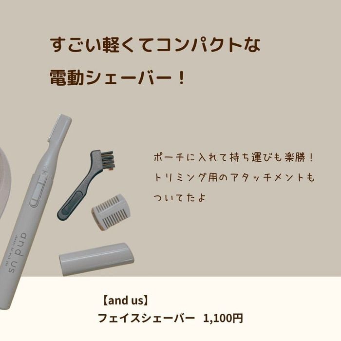 マリエさんが3COINSで購入したのは、フェイスシェーバー。男女問わず使いやすいグレーのカラーリングと、ポーチなどに入れて持ち運びやすい細身でシンプルなデザインが高ポイント。お手入れに便利なブラシ付きなのも嬉しいですね。こちらは1,100円商品のようです。